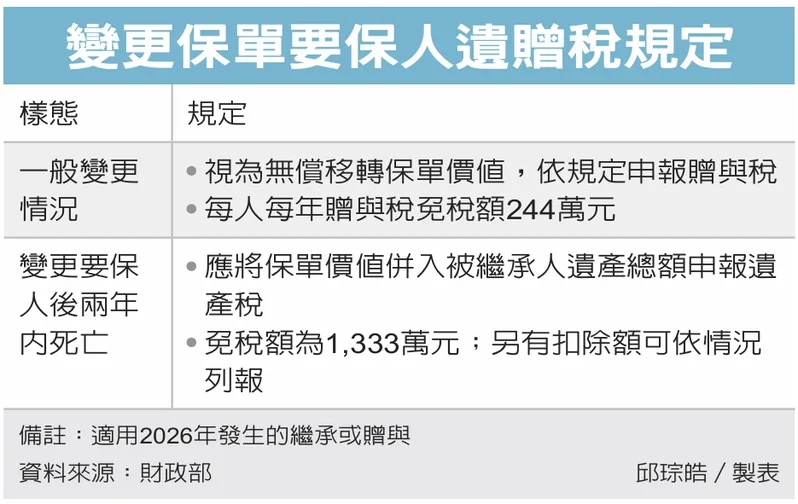 依規定,若無償變更保單要保人,應申報贈與稅;若父母在變更要保人為子女後兩年內去世,繼承人應將保單價值併入被繼承人遺產總額,申報遺產稅。